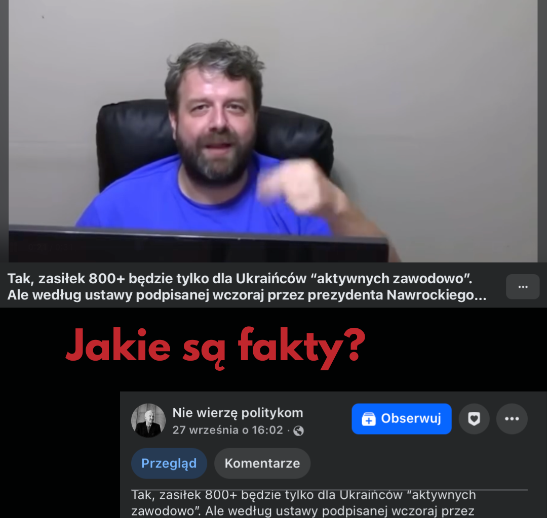 Autor posta opiera się na fakcie – ale manipuluje jego znaczeniem. Pomija regulacje, które jasno określają warunki i ograniczenia dostępu do świadczeń. Tworzy w ten sposób obraz rzekomej „furtki dla Ukraińców”, która w rzeczywistości jest elementem polskiego systemu prawa pracy i świadczeń, obowiązującym wszystkich – niezależnie od narodowości.